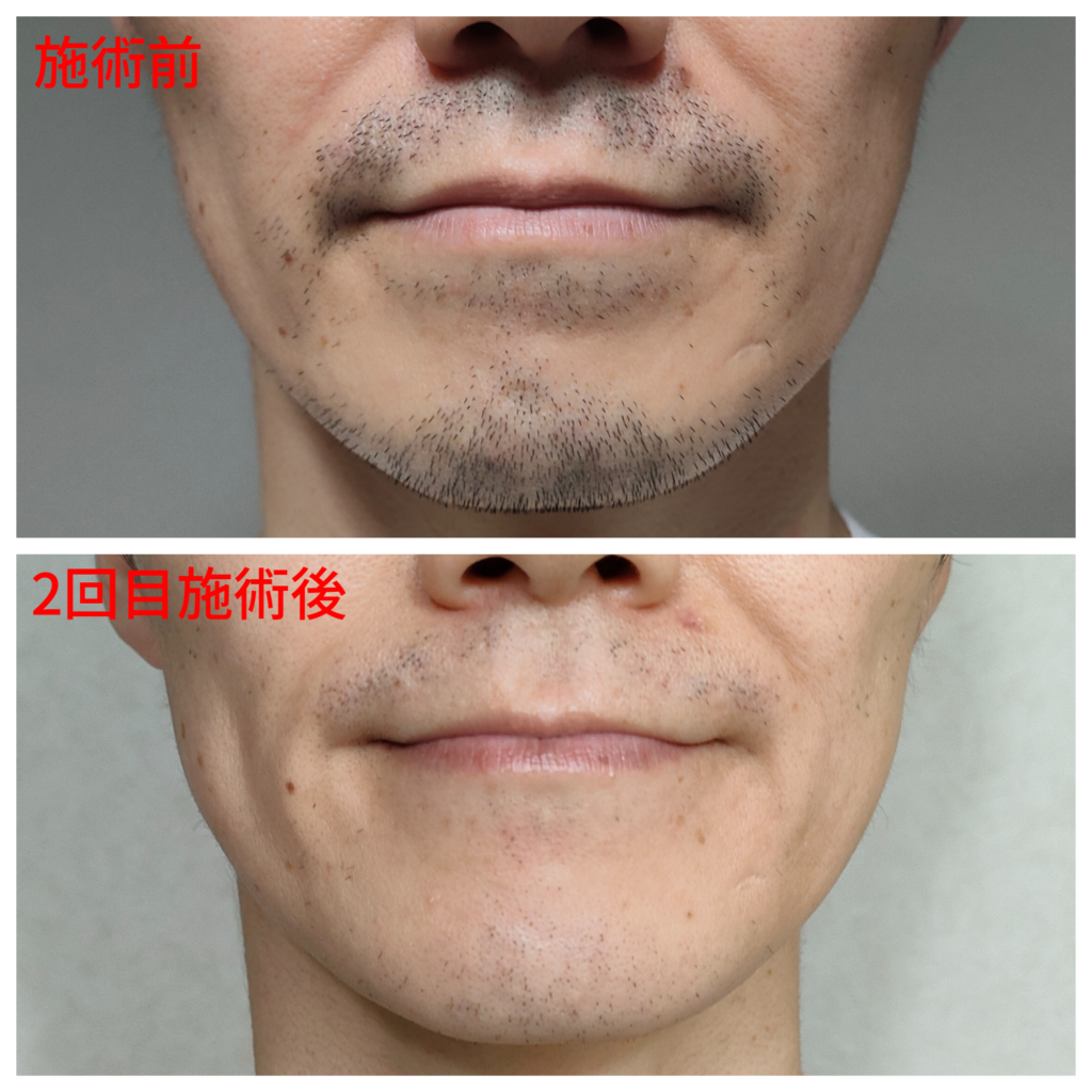 痛みについては、事前に看護師さんから「輪ゴムでパチンとされるような痛み」と伺っていて、レーザーを照射すると、レーザーがヒゲにバチッと反応して強めの痛みを感じます。連続的な中くらいの痛みを感じたダイオードレーザーと比べると、瞬間的な大きめの痛みを感じました。しかし、笑気麻酔のお陰で耐えられるレベルの痛みでした。ヒゲの密度が高いあごが一番痛かったです。鼻下が痛そうで怖かったのですが、あごほどではありませんでした。